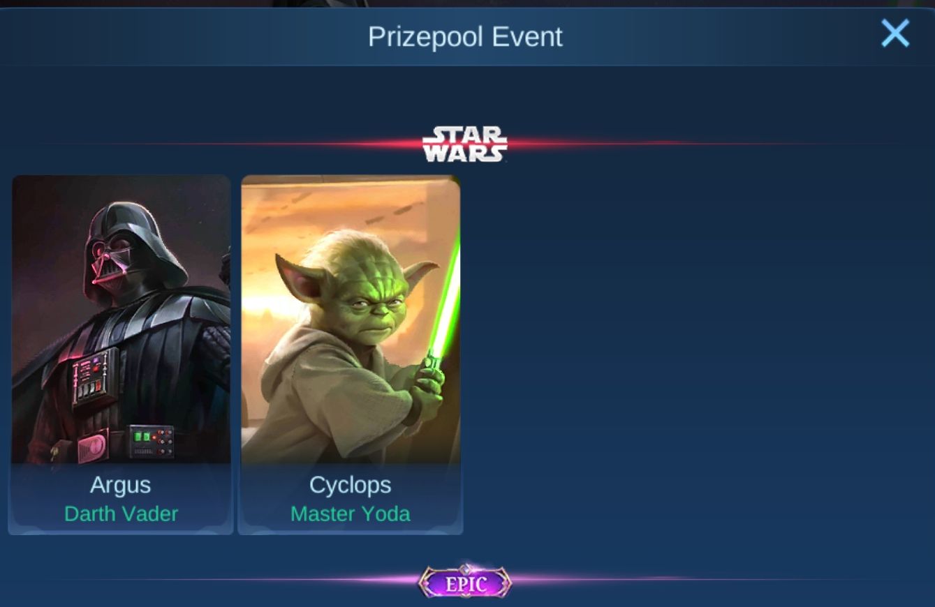 Have ML-ers got Skin MLBB X Star Wars Argus Darth Vade and Cyclops Master Yoda. Moonton sendiri masih berusaha mendapatkan kesepakatan dengan Star Wars agar kolaborasi tersebut dapat segera dirilis. Thank you guys for the supportStar Wars x MLBB 2nd week. Attack on Death Star. Login and Complete tasks to get Galactic Tickets. Boots on the Ground. Event tambahan hadir di bocoran kali inikalian bisa dapat tiket tambahan untuk draw di Event MLBB X STAR WARSGalacticTicket BountyOrder MobileLegends. A few months after leaks of a Star Wars-themed skin background have started emerging in the MLBB community.