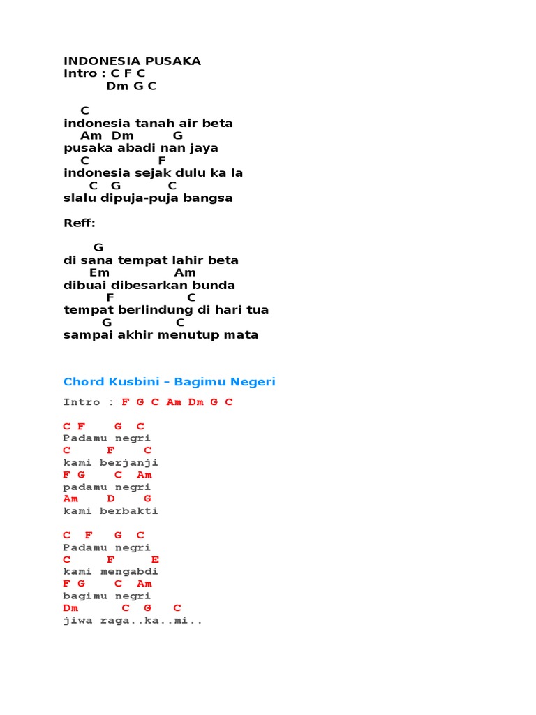 I play in C-key Intro F C C G C 1st Stanza Verse C C Indonesia tanah air beta Am F G Pusaka abadi nan jaya C C7 F Indonesia sejak dulu kala C G C Tetap di puja-puja bangsa Chorus G G Di sana tempat lahir beta Em Am Dibuai dibesarkan bunda F C Tempat berlindung di hari tua C G C Tempat akhir menutup mata 2nd Stanza. Indonesia tanah air beta. C F C Dm G C. Pusaka abadi nan jaya. INDONESIA PUSAKA - ISMAIL MARZUKI Tutorial Ukulele Genjreng Chord Lirik By. DUNIA KITA size. C -C7 F Fm indonesia sejak dulu kala C G C slalu dipuja-puja bangsa. Chord Gitar Indonesia Pusaka - Ismail Marzuki Lirik Lagu Indonesia Tanah Air Beta.