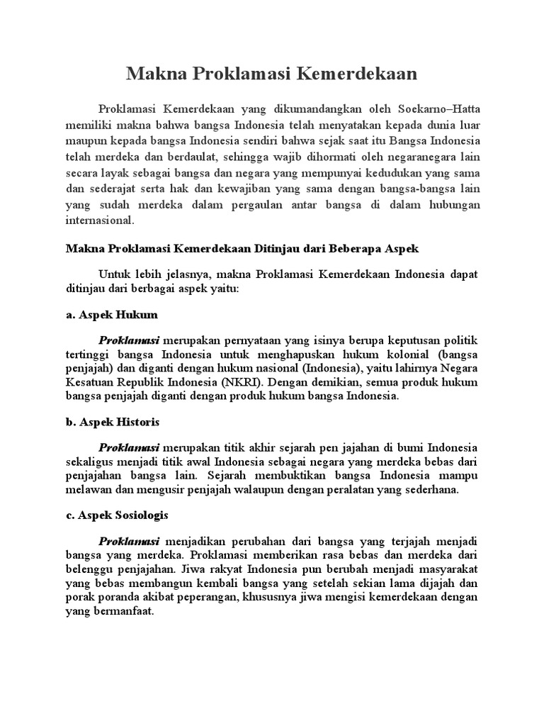 Makna proklamasi ditinjau dari aspek historis ~ Untuk lebih jelasnya makna Proklamasi Kemerdekaan Indonesia dapat ditinjau dari berbagai aspek yaitu. Maka dari itu salah satu makna proklamasi kemerdekaan yang paling penting adalah persatuan dan kesatuan. Memang, tidak bisa dipungkiri baru-baru ini telah diburu oleh konsumen sekitar kita, mungkin salah satunya adalah kalian. Orang sekarang terbiasa menggunakan online di gadget untuk melihat gambar dan video informasi untuk inspirasi, dan menurut judul dari artikel ini saya akan diskusikan tentang Makna Proklamasi Ditinjau Dari Aspek Historis Indonesia merupakan sebuah Negara yang sangat kaya mempunyai kebudayaan yang beragam mulai dari agama ras suku bahasa daerah dan.